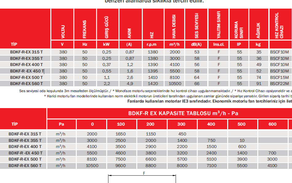Dikdörtgen gövde galvaniz sacdan üretilmektedir. Bdkf-r 315-355-400 modellerinin fanları  korozyona karşı dirençli yüksek kaliteli galvaniz çelikten üretilmiştir. Bdkf-r 450-500-560 modellerinin fanları ise alüminyum sacdan imal edilmiştir. Bütün modellerde Ex Proof özellikli asenkron motor kullanılmaktadır. Emiş flanşı bakır malzemeden üretilmektedir. Motor hava akımı dışarısındadır. Cihaz max.120ºC sıcaklığında hava taşıma özelliğine sahiptir.