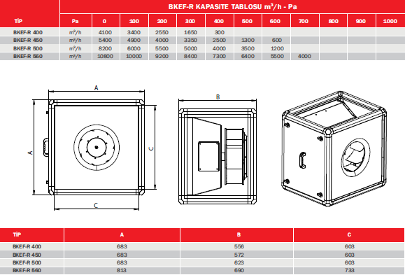 Isı ve ses izolasyonuna sahip çift cidarlı gövde galvaniz sacdan üretilmektedir. Bkef-r 400 modelinin fanı korozyona karşı dirençli yüksek kaliteli galvaniz çelikten üretilmiştir. Bkef-r 450-500-560 modellerinin fanları ise alüminyum sacdan imal edilmiştir. Bütün modellerde asenkron motor kullanılmaktadır ve motor hava akımı dışarısındadır. Cihaz max.120ºC sıcaklığında hava taşıma özelliğine sahiptir.
