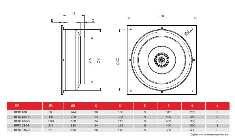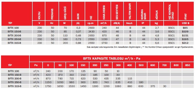 Kare kasa elektrostatik boyalıdır. Çark preslenmiş korozyona dayanıklı yüksek kaliteli galvaniz sac metalden üretilmiştir. Bütün modeller kapalı yapıya sahip dıştan rotorlu motora sahiptir ve max.40ºC sıcaklığında hava taşıma özelliğine sahiptir. Duvar üzerinde çalışmaya uygun tasarlanmıştır. Her pozisyonda çalıştırılabilir. Talep doğrultusunda motor yüksek ısıya karşı termik korumalı olarak üretilebilir. Klemens kutusu standart olarak ürün ile birlikte sunulmaktadır. Emiş ağzı kanal çaplarına uyumludur ve kelepçe ile bağlanabilir.