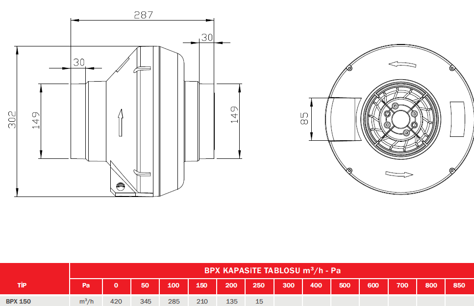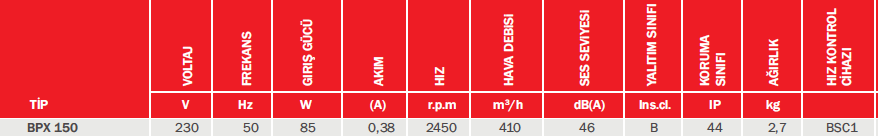 Kasa plastik malzemeden üretilmiştir. Fan preslenmiş korozyona dayanıklı yüksek kaliteli galvaniz sac metalden üretilmiştir. Kapalı yapıya sahip dıştan rotorlu motora sahiptir. Montaj ayakları standart olarak ürün ile birlikte sunulmaktadır. Max.40ºC sıcaklığında hava taşıma özelliğine sahiptir.