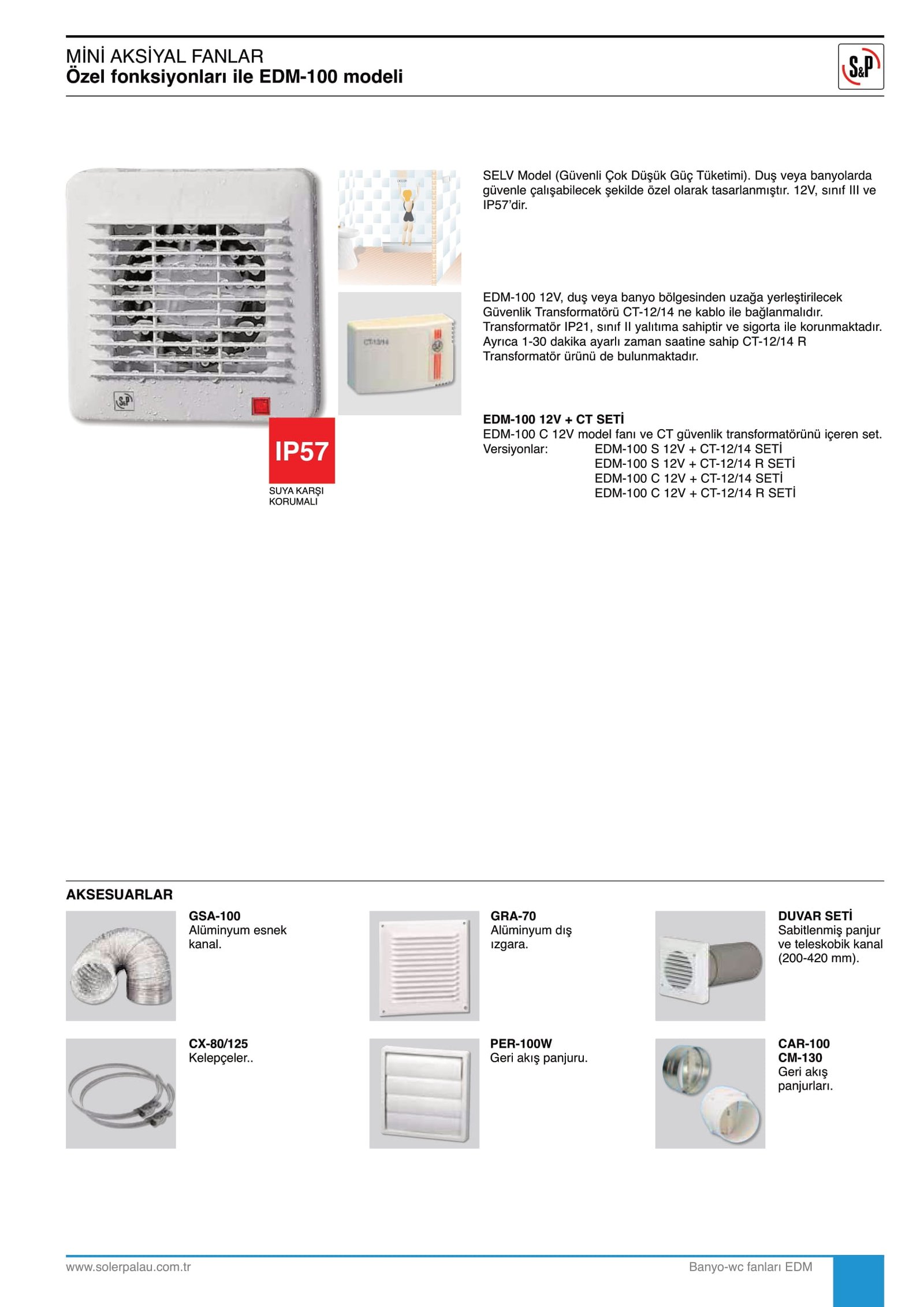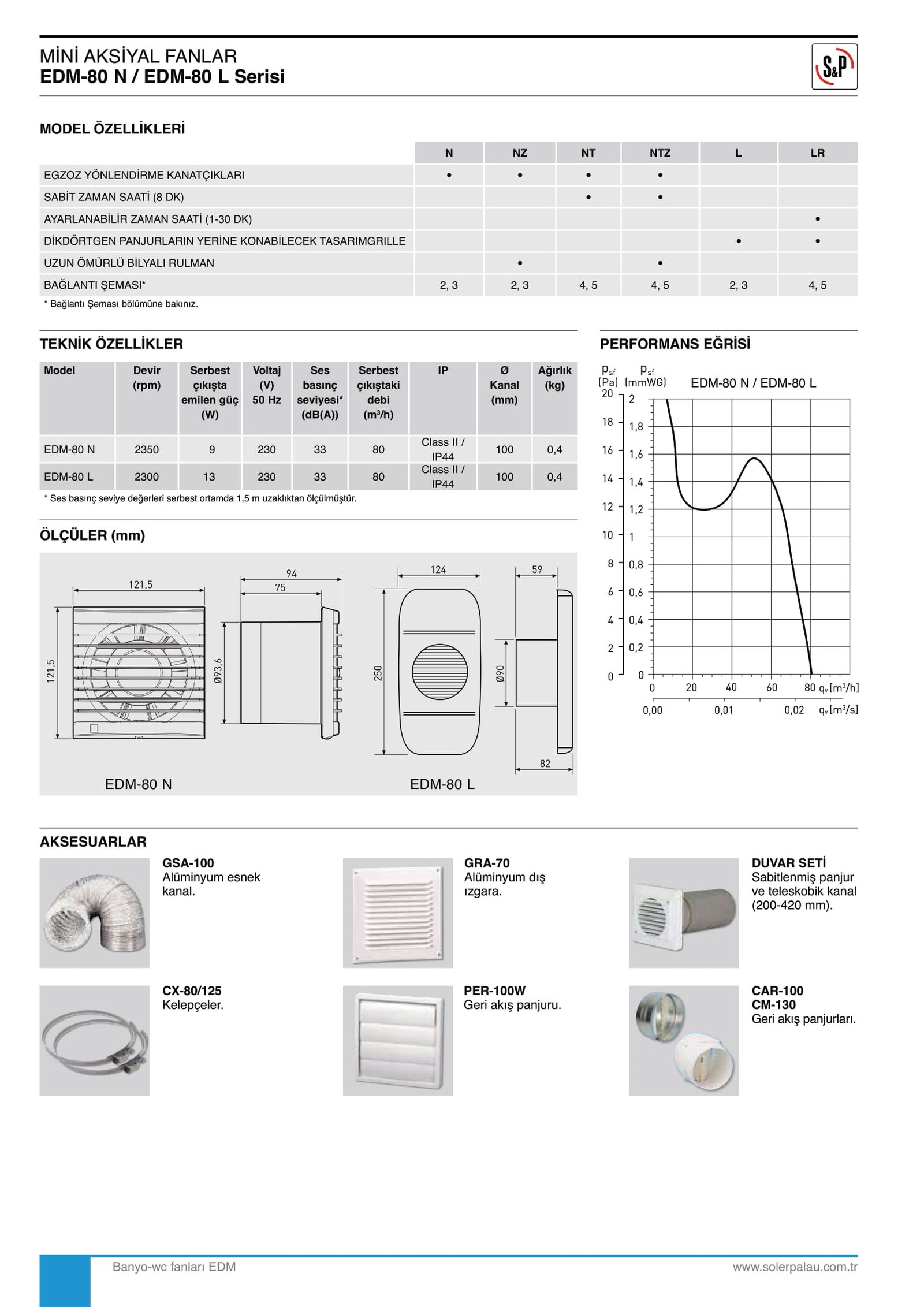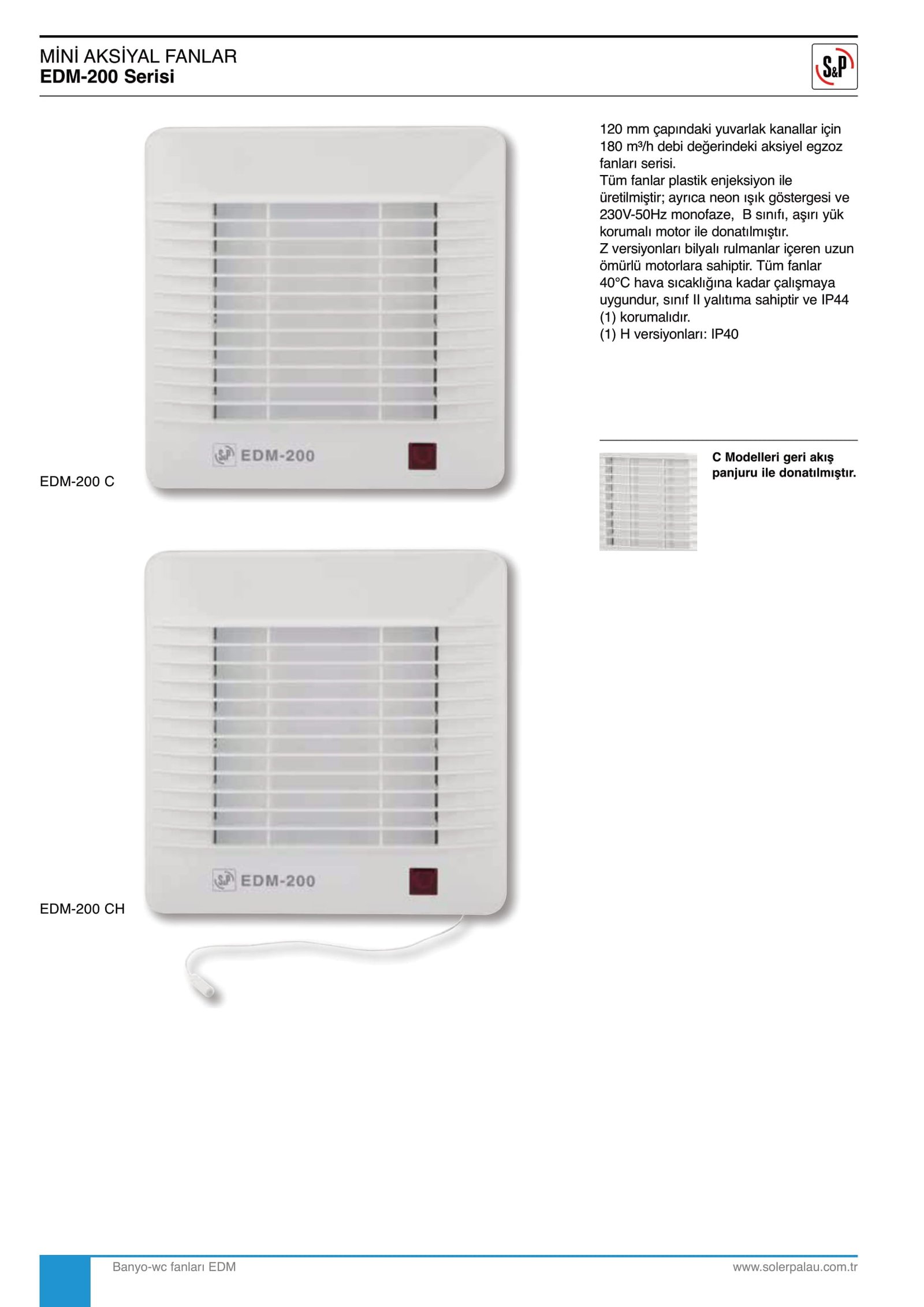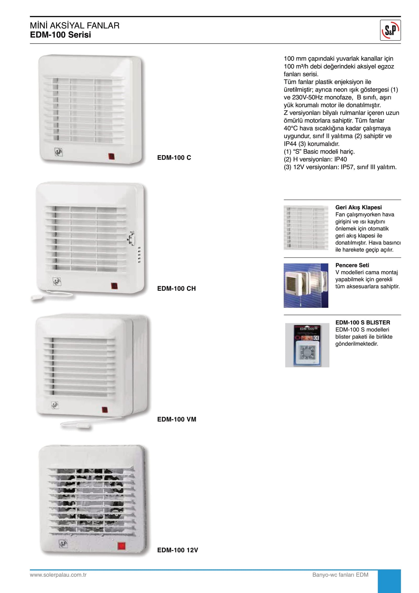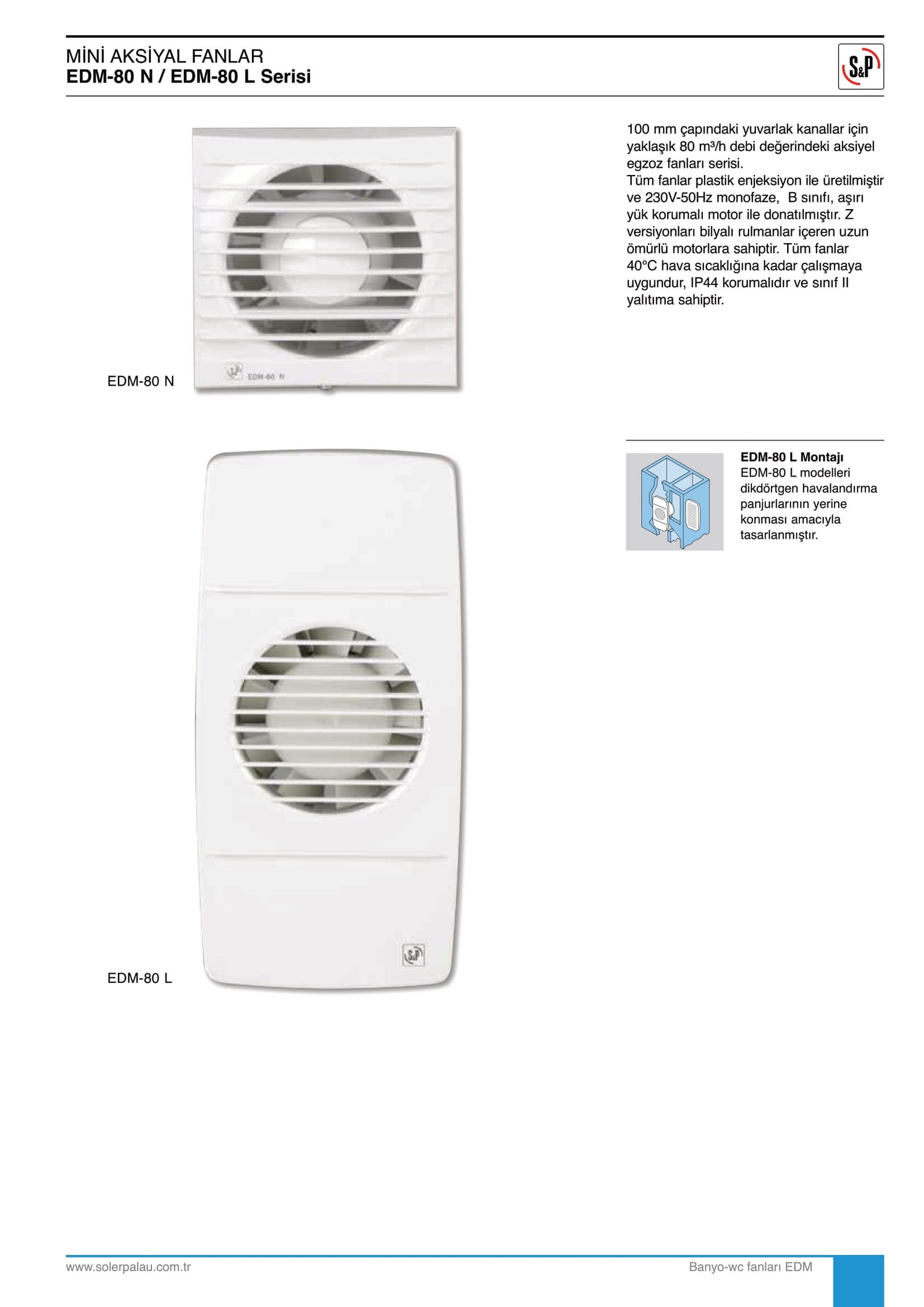 Duvar veya tavana monte edilebilen EDM serisi aksiyel fanlar otomatik panjurludur. Plastik enjeksiyon yöntemiyle üretilen fanların 80, 100, 180, 280 m³/h debi değeri ve Ø100, 120, 150 mm çapında 4 farklı modeli bulunmaktadır.