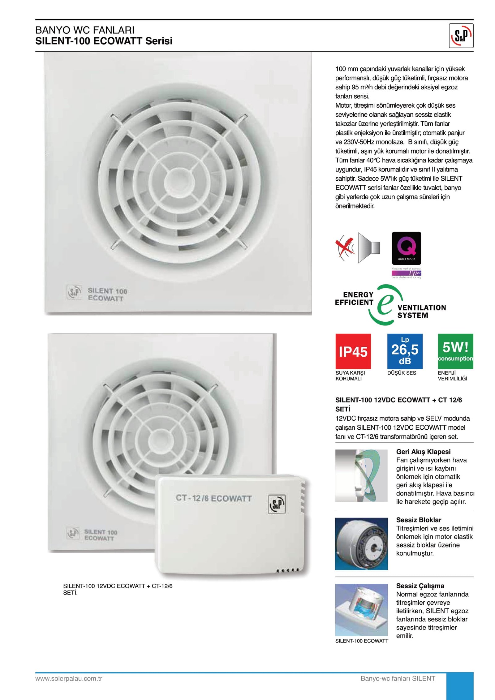 Silent serisi sessiz fanların B sınıfı, düşük güç tüketimli ve aşırı yük korumalı motorları, titreşimi önleyici elastik takozlar üzerine yerleştirildi. Bu sayede Silent serisi sessiz fanlar 26,5 desibele kadar düşük ses seviyesiyle çalışarak sessiz sedasız havanızı tazeler.