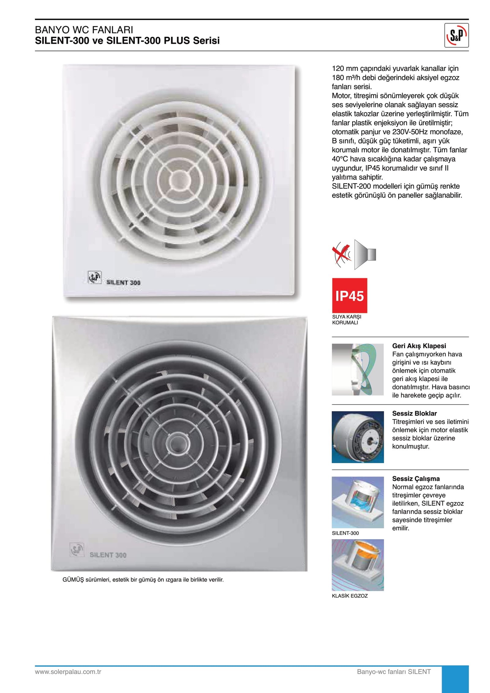 Duvara veya tavana monte edilebilen Silent Serisi aksiyel fanlar son derece sessiz çalışır. Plastik enjeksiyon yöntemiyle üretilen fanların 95, 180, 280 m³/h debi değerinde ve Ø100, 125, 150 mm bağlantı çapında 3 farklı modeli bulunmaktadır. Tüm fanlar 40°C hava sıcaklığına kadar çalışmaya uygundur.